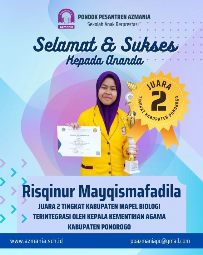 Alhamdulillah santriwati MA Azmania berhasil mendapatkan Juara 2 dalam Lomba KSM (Kompetisi Sains Madrasah) tingkat Kabupaten mapel Biologi Terintegrasi oleh Kepala Kementrian Agama Kabupaten Ponorogo. Santriwati MA yang berhasil meraih juara 2 tersebut adalah ananda Risqinur Mayqismafadila. Semoga bisa terus berkembang dalam mengembangkan bakatnya ya. Keep Spirit.