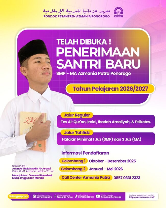✨Let’s Join Us!✨ 📚Penerimaan Santri Baru SMP & MA Azmania Ponorogo telah dibuka! 💡Program Unggulan: ✅Pembinaan Karakter & Akhlak Islami ✅Tahfidz & Pengamalan Al-Qur’an ✅Lifeskill & Leadership Training ✅Penguasaan Bahasa Arab & Inggris ✅Lingkungan Nyaman, Asri & Kondusif 📅Daftar Sekarang! Gelombang 1: Okt-Des 2025 | Gelombang 2: Jan-Mei 2026 ☎️Info pendaftaran? Klik link byt.ly/psbazmaniapo atau hubungi…