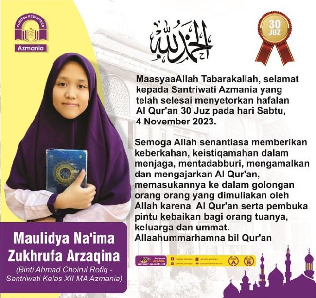 Masyaallah Tabarakaallah, Selamat Kepada Maulidya Na’ima Zukhrufa Arzaqina binti Ahmad Choirul Rofiq, Santriwati kelas XII MA Azmania telah menyelesaikan setoran hafalan Al Qur’an 30 Juz.
